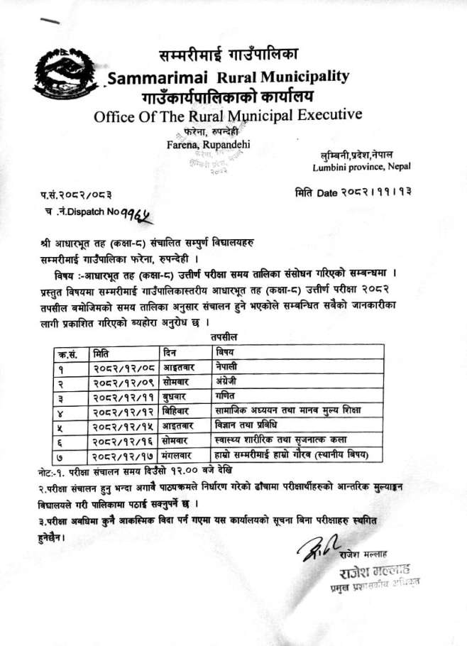 » आधारभूत तह (कक्षा-८) उत्तीर्ण परीक्षा समय तालिका संसोधन गरिएको सम्बन्धमा।