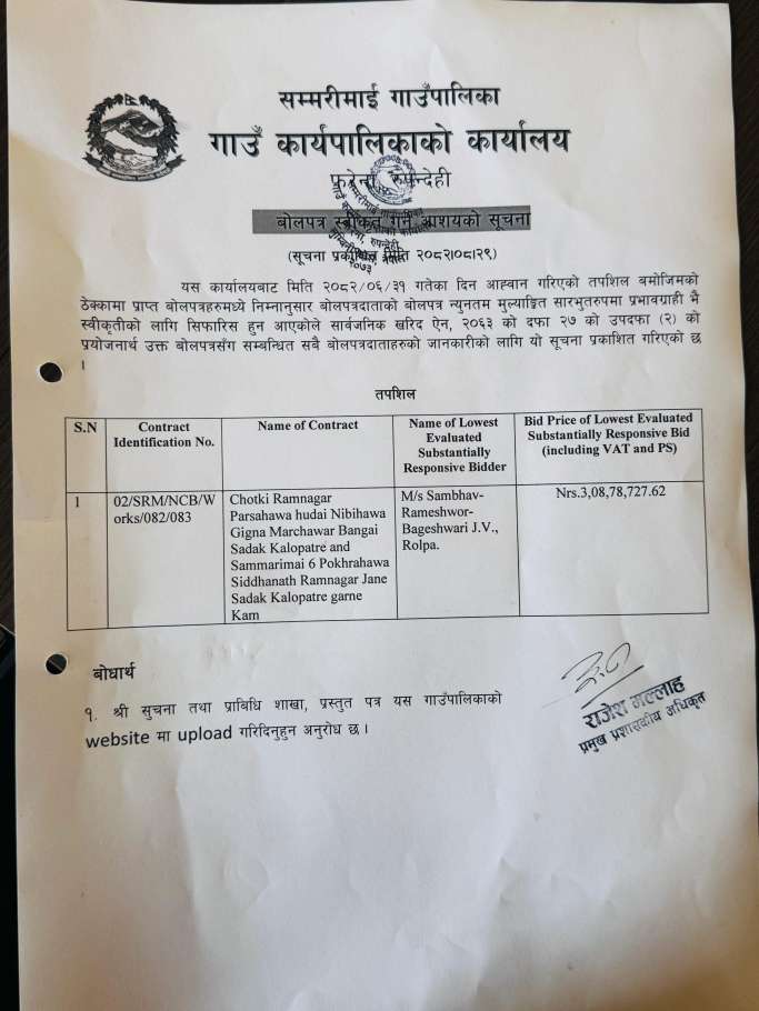 बोलपत्र स्वीकृत गर्ने आशयको सूचना ।