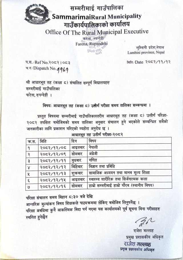 आधारभूत तह (कक्षा ८) उतीर्ण परीक्षा समय तालिका सम्बन्धमा ।