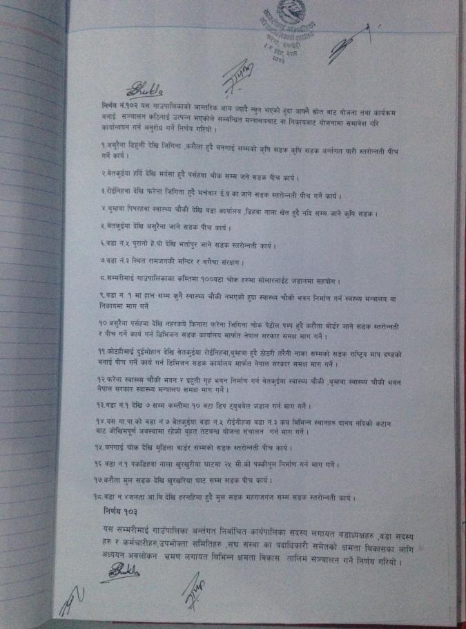सम्मारीमाइ गाउपालिका को कार्यपालिका को निर्णय हरु